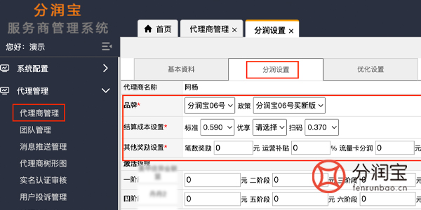 再在代理管理中给代理配置分润设置,选择添加好的政策及结算价成本等,POS分润系统会根据设置系统计算分润结算给代理上,(注:在给代理设置分润之前,必须先给团队设置好,设置步骤都是一样的)