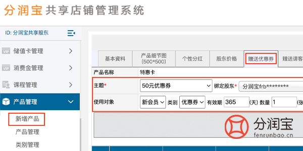 ·线上优惠券:通过共享店铺系统发放优惠券,系统可手动给值得的股东会员发放优惠券,顾客还可以通过购买商品或者储值获得优惠券。