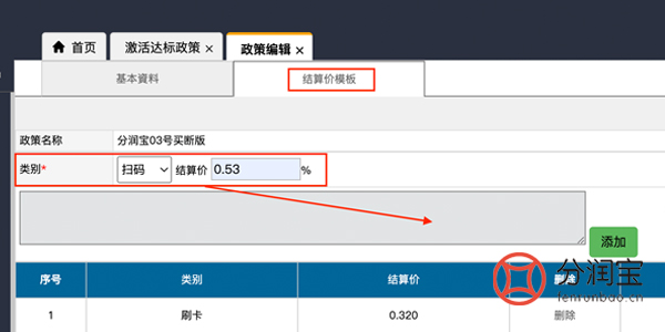 激活达标政策设置好之后,添加结算价模版,模版可设置很多个,供后期传统模式下的代理给下级配置不同的结算价,从而赚取差价分润。如图所示