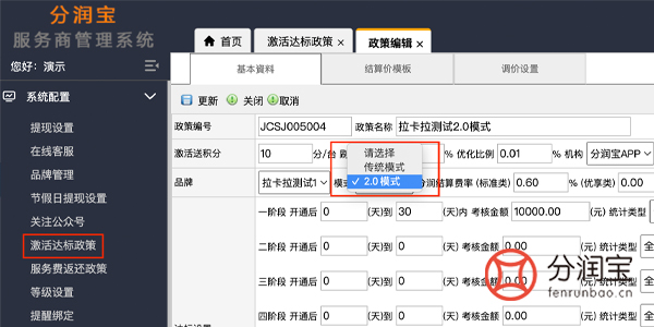 在支付联盟系统中配置激活达标政策,可根据具体规则设定传统模式/2.0模式,填写“政策名称”、“激活台数”、“阶段考核金额”页面等相关信息。