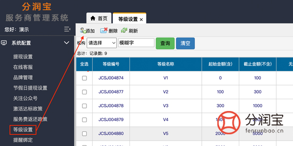 若是2.0模式点击等级设置,按照交易的起始金额/截止金额,当交易量达到等级数额,即将升级。