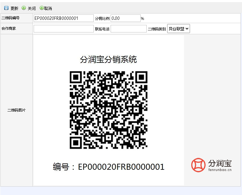 然后再次回到“二维码查询”页面点击“修改”,可以设置“分佣比例”,这里的分佣比例就是分前面“产品管理”中设置的“共享推广佣金”那部分的金额。至此异业联盟二维码在系统后台的设置步骤就完成了。