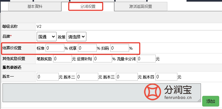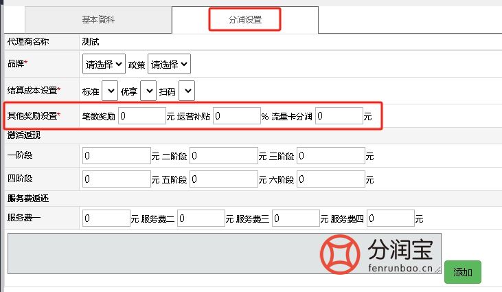 但是这里的流量卡分润奖励我们系统后台默认只返还一次(如果想要分多次返还请联系我们分润宝客服专员),给到代理商多少就填多少。同样上级也会享受下级流量卡分润的级差。