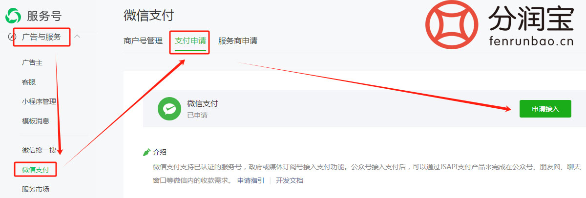 公众号认证成功后需要开通商户号的话,可以在公众号后台找到“广告与服务”→“微信支付”→“支付申请”→“申请接入”,然后在申请接入界面下方复制APPID备用,点击“申请接入”后公众号管理员扫码进入后填写相关资料并提交即可。