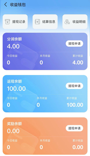 分润宝支付联盟系统为代理商提供多元收益渠道,一般而言,代理商收益可分至三个钱包:分润钱包、返现钱包、奖励钱包。