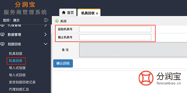 进入支付联盟系统后台,找到划拨回收-机具回收,按页面需求填写起始机具号、截止机具号,确认回收。