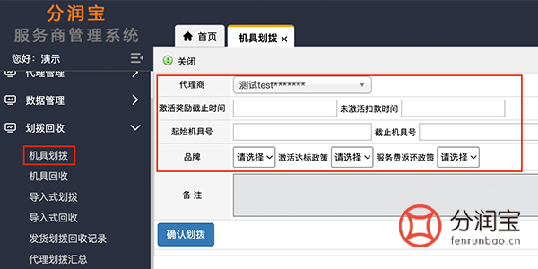 机具回收之后,找到机具划拨,选择及填写页面上代理商、激活奖励截止时间、未激活扣款时间、起始机具号、截止机具号、品牌、激活达标政策、服务费返还政策,确认划拨。