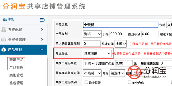 在分销系统中储值卡管理中设定储值金额。例如,普通会员储值 200 元,系统自动触发升级机制,将其升级为分红股东,享受共享股东权益。