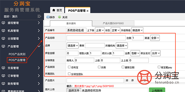 进入产品上传界面:在支付联盟系统后台中找到 “产品管理”“POS产品管理” 添加,点击进入产品上架页面。