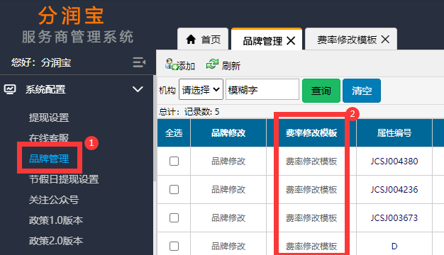 2、品牌管理,找到对应的品牌,点击“费率修改模板”,进去添加对应的不同交易类型的费率