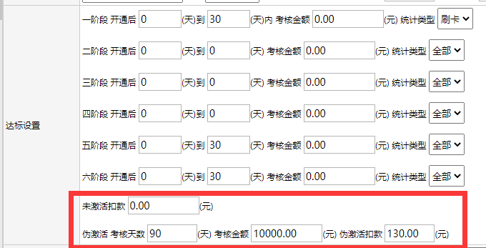 第一步、找到系统配置——激活达标政策管理,入下图所示,设置好伪激活和未激活的考核及扣款金额。