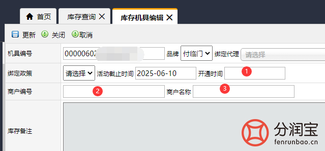 4、进入商户信息编辑页面,完善对应的商户号和开通时间。