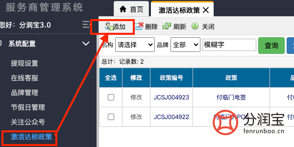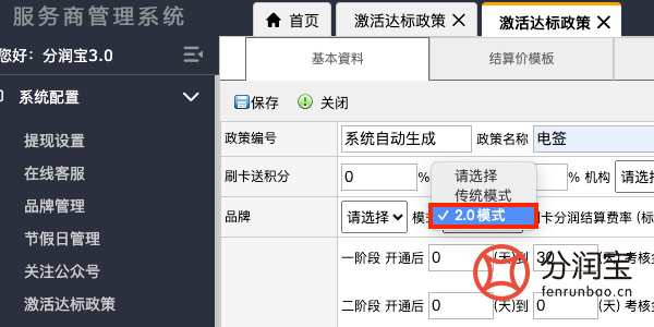 填写相应的政策名称,默认的费率,选填品牌、机构,模式选择2.0的模式,点击保存。