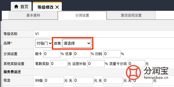 在等级设置更新之后,点击分润设置就能看到前面设置的2.0模式政策,选择对应的政策名称及填写其他设置。