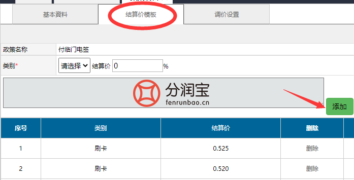 一、登录POS支付联盟系统,进入系统配置——激活达标政策,点修改,然后进入“结算价模版”,把允许代理商设置的代理商分润结算价都添加进去,比如刷卡类0.51——0.54,扫码类0.30——0.37逐一添加进去。