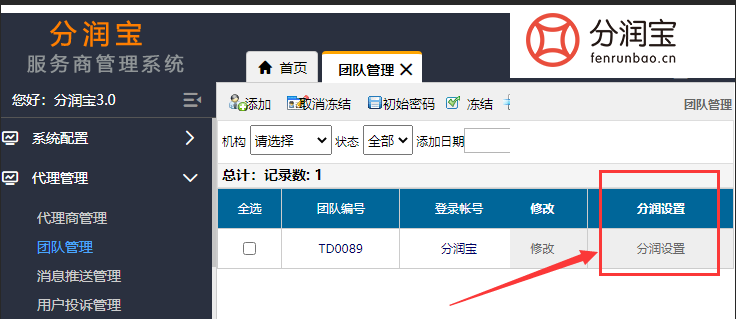 二、设置所属团队的,对应政策的分润结算价,代理商体系就类似一个金字塔层级关系,那么分润比例和结算点数就要从最顶端的用户开始匹配设置,也就是团队的分润设置。进入“代理管理”——“团队管理”——分润设置