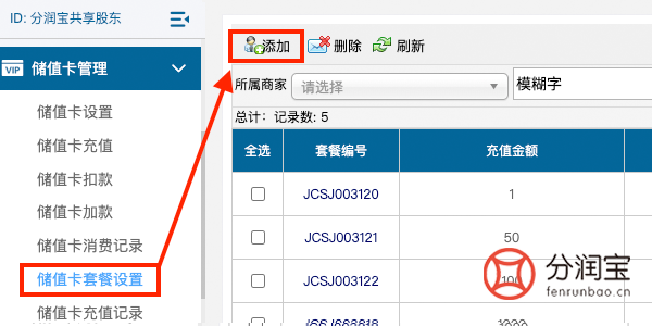 1、进入>>储值卡管理-->>储值卡套餐设置-->>添加