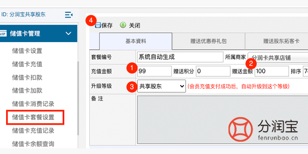 2、储值卡管理-->>储值卡套餐设置-->>添加(①充值金额:99,②赠送金额100,③升级等级:共享股东,④保存)