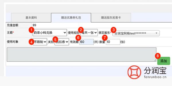 3、储值卡管理-->>储值卡套餐设置-->>选择添加的99元套餐点击修改-->>赠送优惠券礼包(①主题:奶茶小料,若未设置主题需在-->>贵宾卡管理-->>贵宾卡主题添加主题,②使用规则:每天一张,③绑定股东:选择对应的股东,④使用对象:不限制,⑤类别:抵扣券, ⑥有效期:60天,⑦数量:10张,⑧:添加)