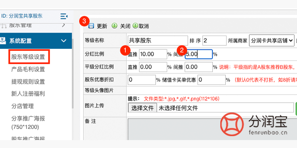 1、系统配置-->>股东等级设置-->>添加(分红比例①直推:10%,②间推:5%,③保存)