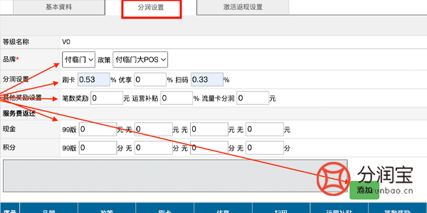 保存成功之后-->>“修改”-->>分润设置,设置各种刷卡和扫码结算价(可添加多个)