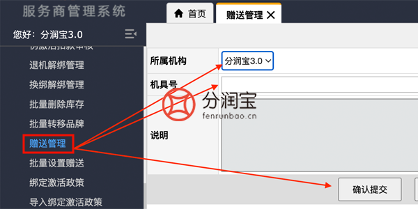 1、机具管理-->>赠送管理(单个机具赠送)-->>选择所属机构-->>填写机具号-->>点击确认提交