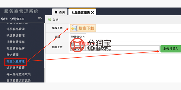 2、机具管理-->>批量设置赠送(多个机具赠送)-->>下载表格模版,按格式填写-->>选择类别-->>上传填写好的模版文件-->>点击上传并导入