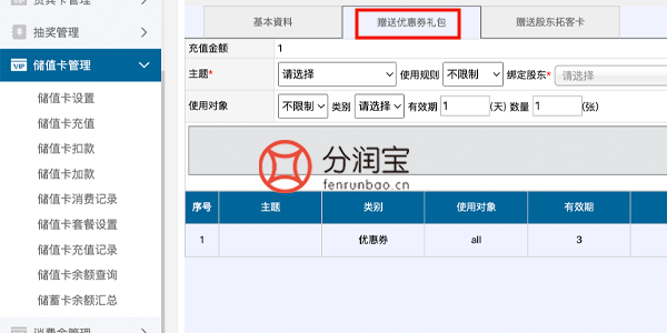 随后,通过共享店铺后台,设置100元的充值套餐,会员注册成功,充值100元就能直接在手机端获得水果店赠送的3张10元优惠券。